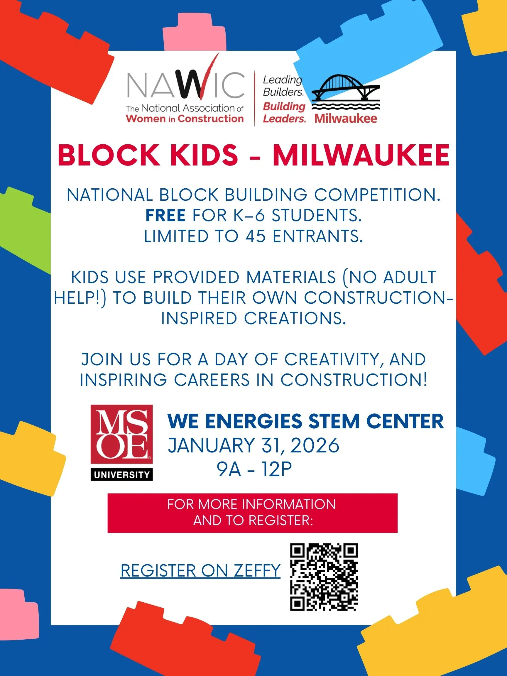 The NAWIC Education Foundation’s Block Kids Building Program is a FREE, hands-on building competition designed to introduce K–6 students to the exciting world of construction. Our Milwaukee Chapter is proud partner with MSOE | STEM Center to host this year’s event and bring this nationally recognized program to local students.